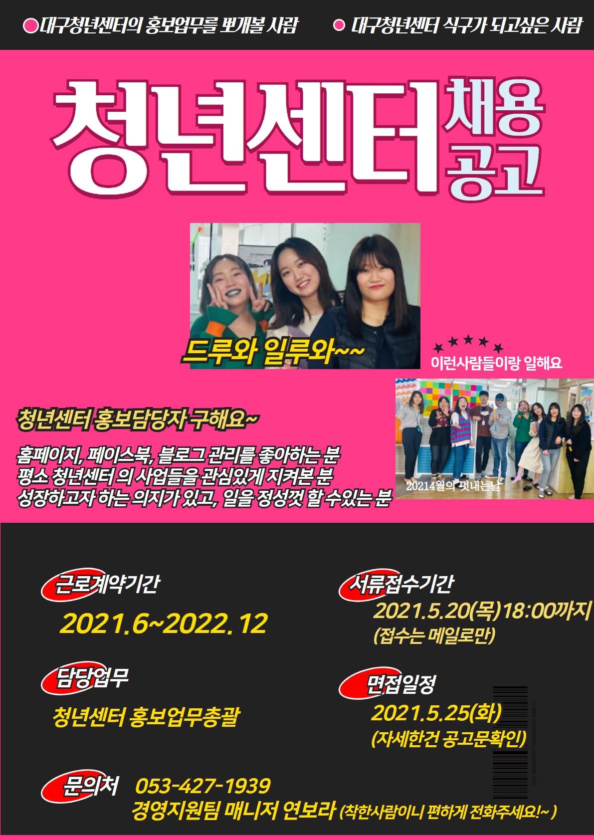2021 대구광역시청년센터 인재채용작성자 : 젊프 작성일 : 21-05-03 대구광역시청년센터