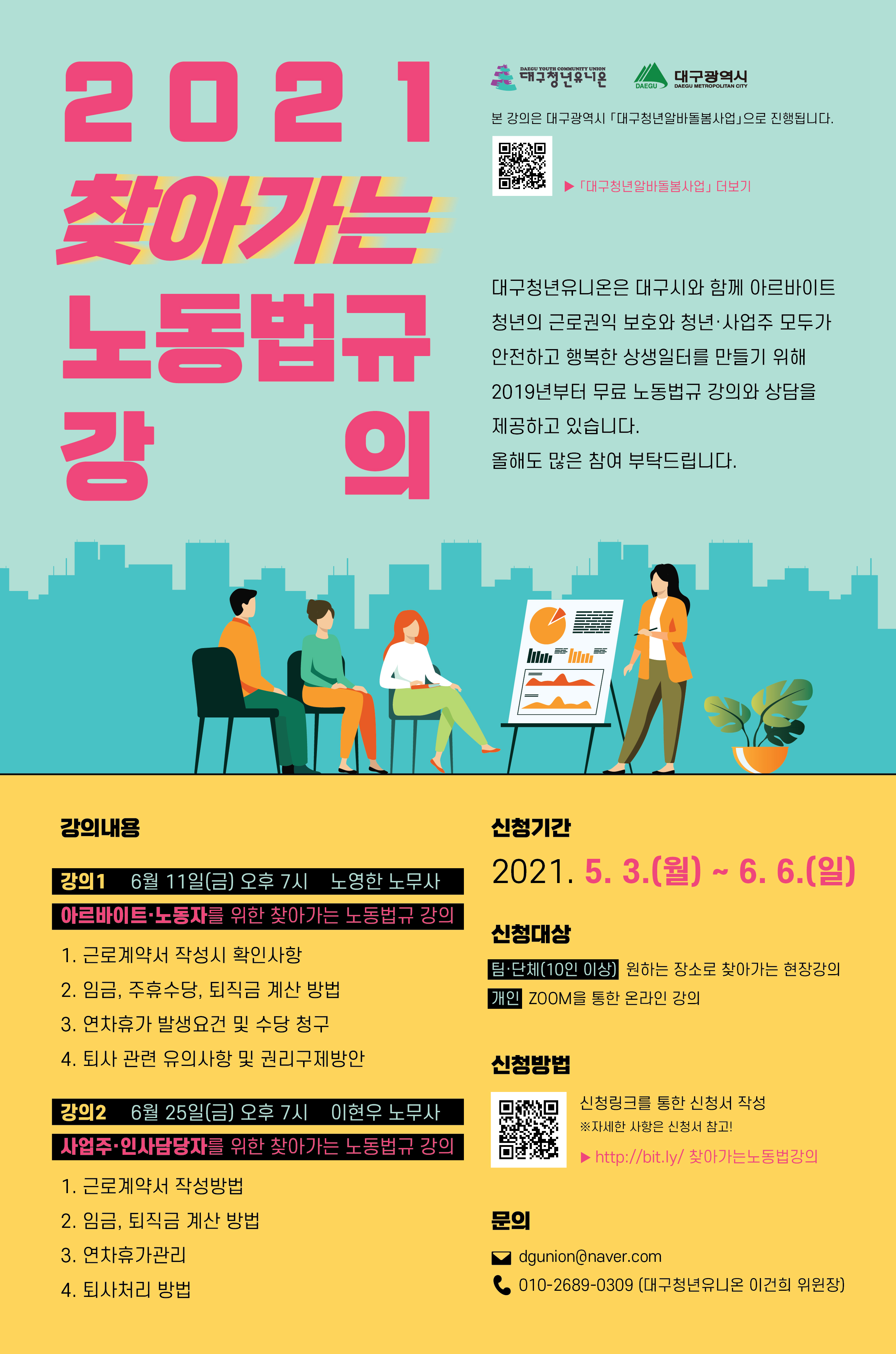 대구청년유니온은 대구광역시와 함께 아르바이트 청년의 근로권익 보호와 청년·사업주 모두가 안전하고 행복한 상생일터를 만들기 위해 2019년부터 무료 노동법규 강의와 상담을 제공하고 있습니다. 올해도 많은 참여 부탁드립니다.