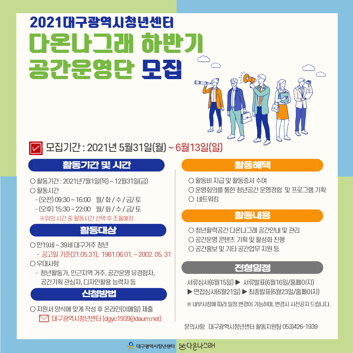2021하반기 청년활력공간 다온나그래 공간운영단 모집작성자 : 정다혜 작성일 : 21-05-31 대구광역시청년센터