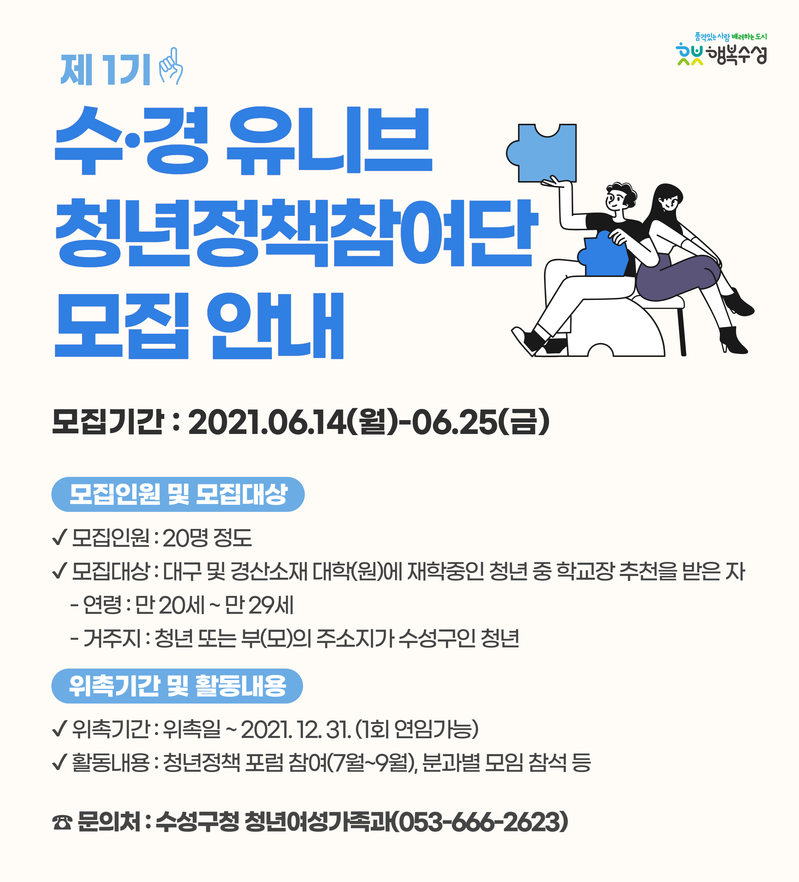 1. 문 의 처 : 수성구청 청년여성가족과 청년정책팀(☎053-666-2623)