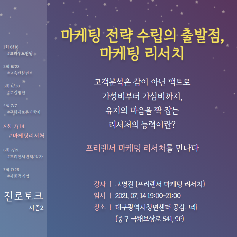2021 청년상담소 진로토크 시즌2 5회차 참여자 모집작성자 : 젊프 작성일 : 21-06-30 대구광역시청년센터