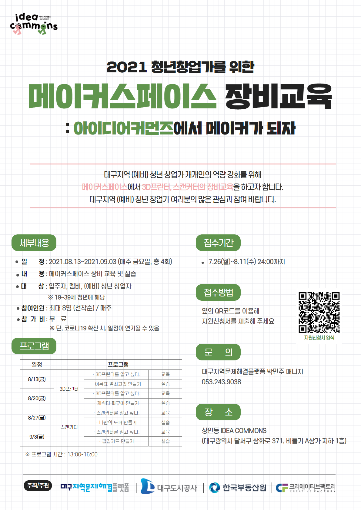 대구지역(예비) 청년 창업가 개개인의 역량 강화를 위해 메이커스페이스에서 3D프린터, 스캔커터의 장비교육을 하고자 합니다.
