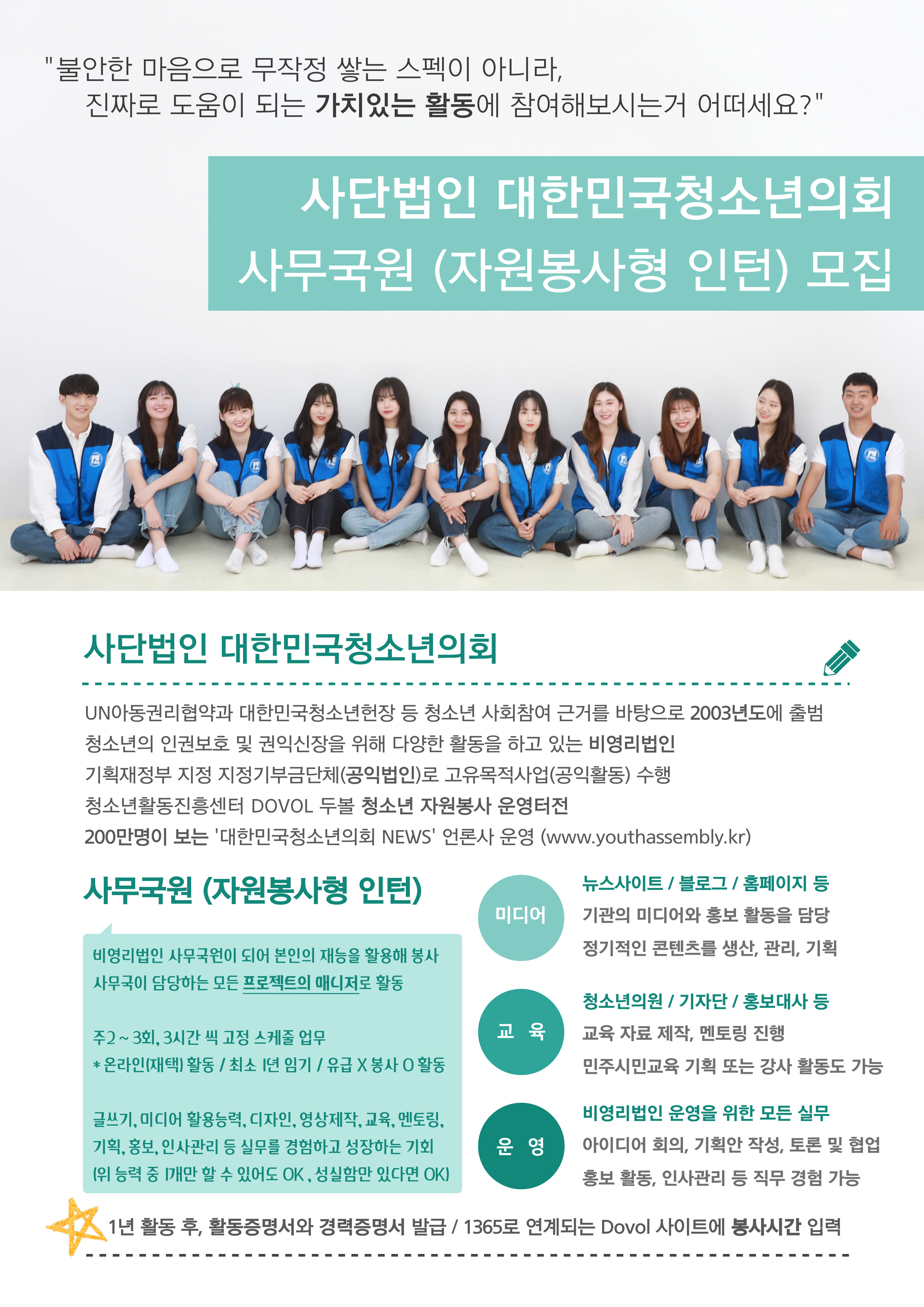 사단법인 대한민국청소년의회 사무국원(자원봉사형 인턴) 모집