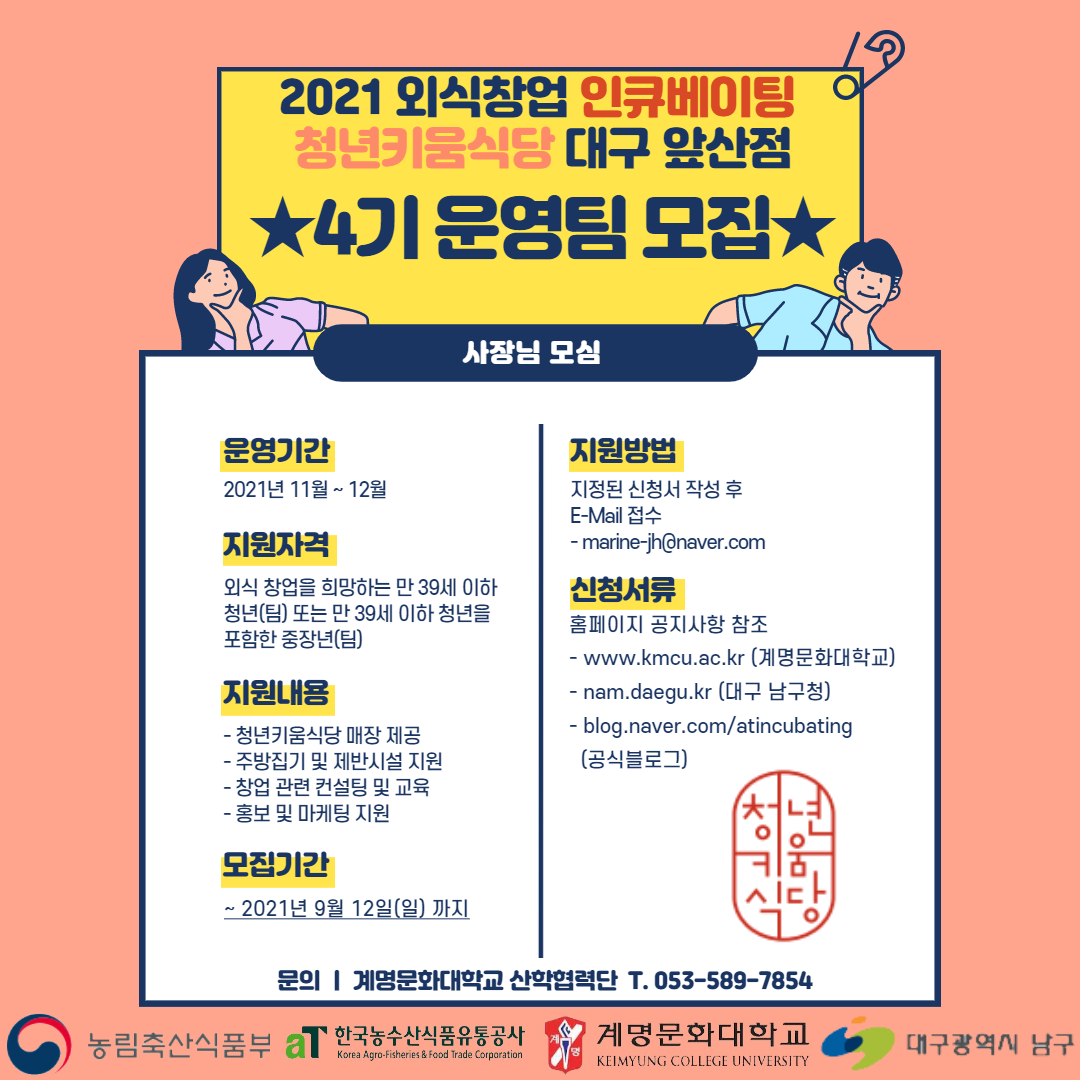 2021년 외식 창업 인큐베이팅, 청년키움식당 대구앞산점 4기 운영팀 모집작성자 : 박정은 작성일 : 21-08-31