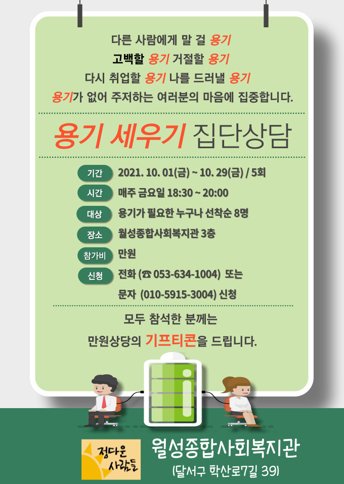 용기가 없어 주저하는 여러분을 위한 [용기 세우기 집단상담] 참여자 모집작성자 : 정은연 작성일 : 21-08-31