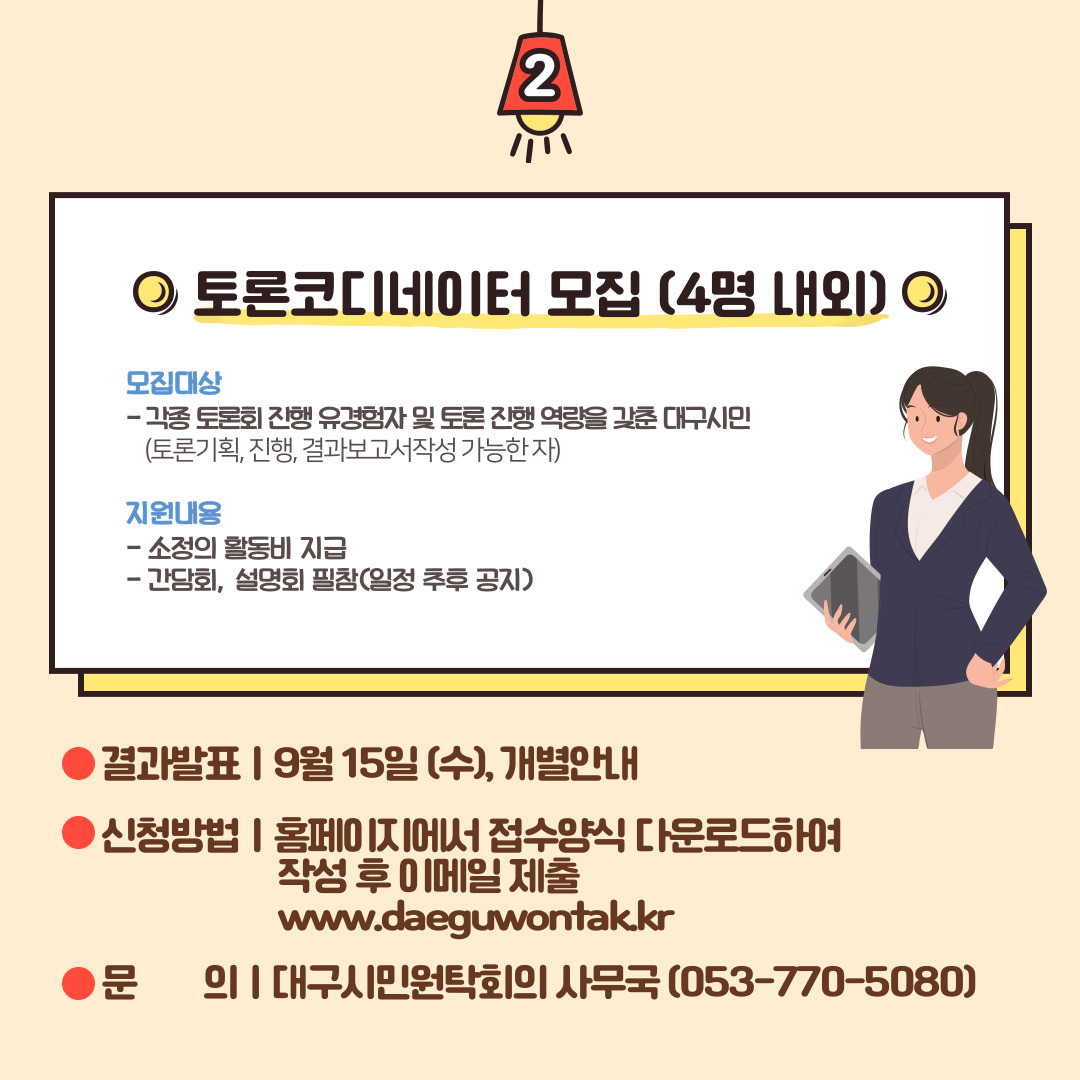 - 각종 토론회 진행 유경험자 및 토론 진행 역량을 갖춘 대구시민