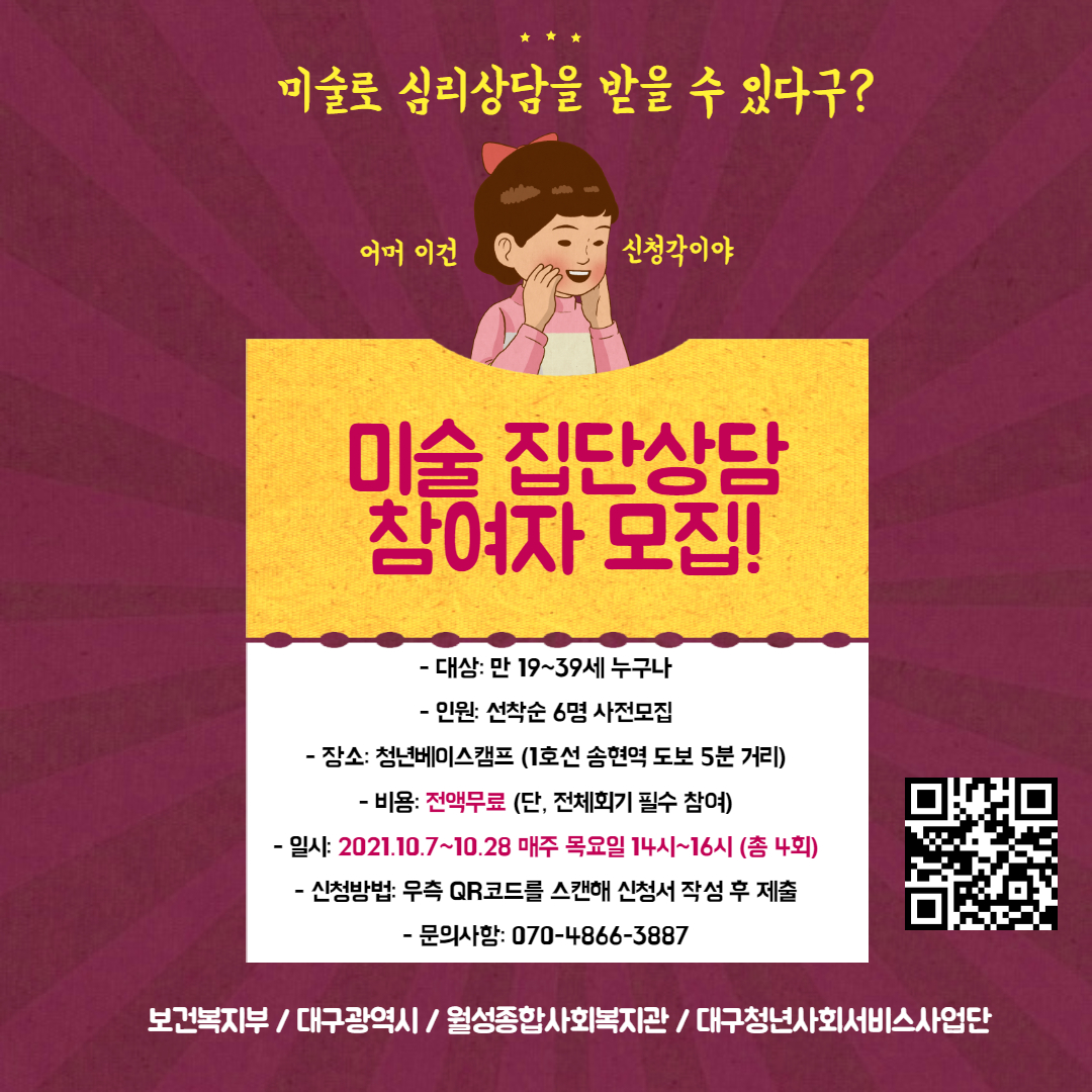 Q. 비슷한 연령대의 청년 구성원들이 미술이라는 매체를 이용하여 자신과 자신의 마음 상태를 표현해보고 집단리더 및 다른 집단원들과 함께 나누고 고민을 해소해 나가는 프로그램입니다.