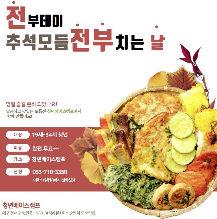 청년베이스캠프에서 청년들과 함께 추석맞이 전(새우전, 삼색꼬지전,동그랑땡,동태전) 만들기를 합니다~~