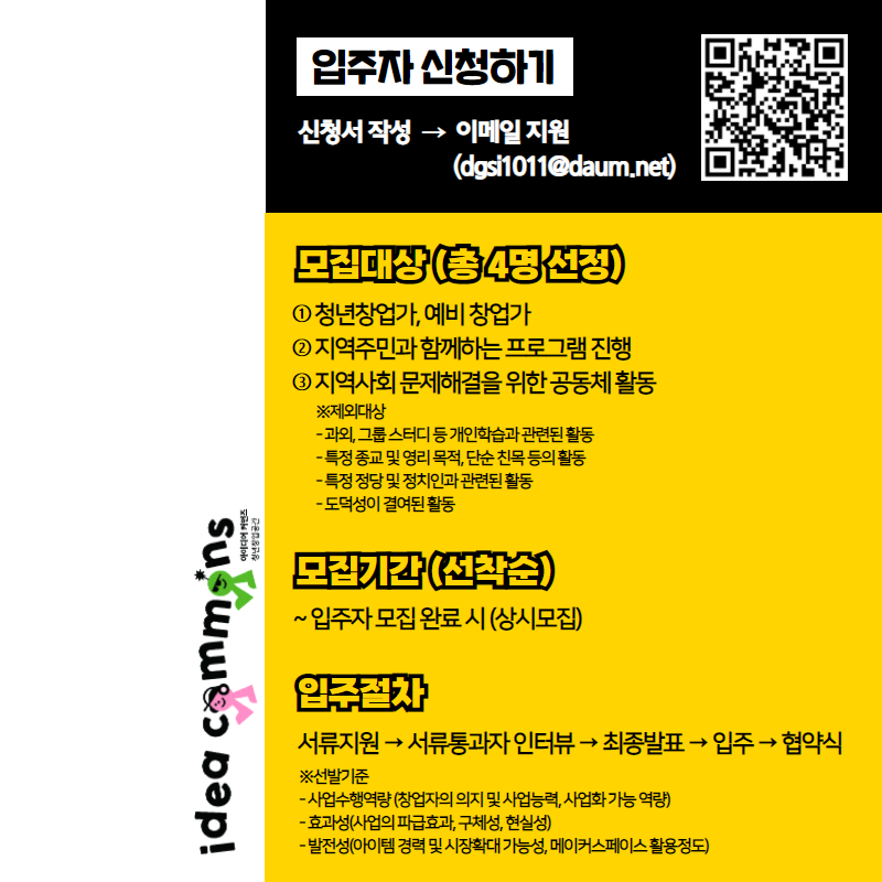 - 서류지원 -> 서류통과자 인터뷰 -> 최종발표 -> 입주 -> 협약식