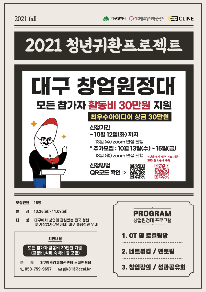 2021 대구 창조경제혁신센터 청년귀환 프로젝트 창업편 '대구 창업 원정대' 참가자 모집작성자 : 표진규 작성일 : 21-10-05