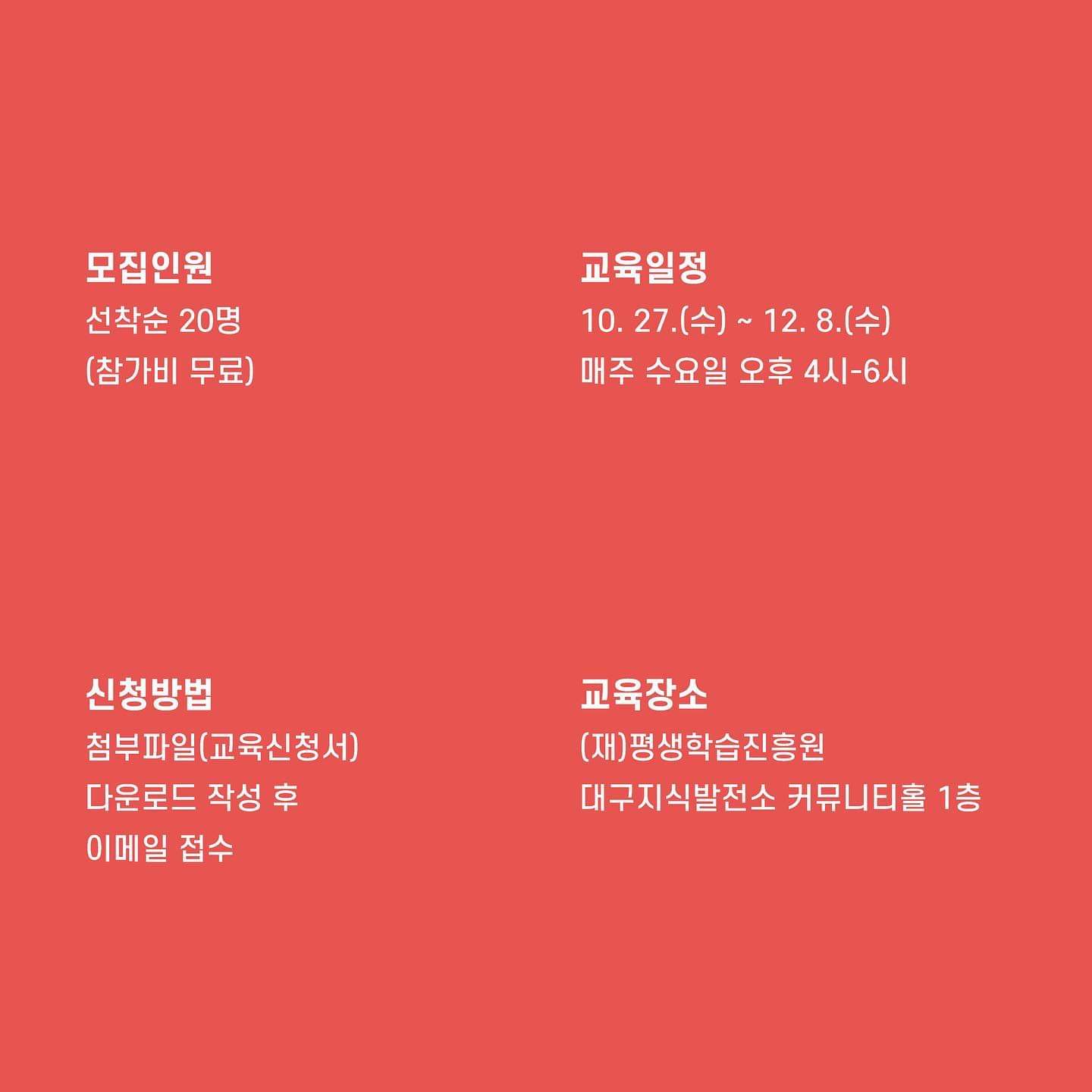 ★10월27일부터 12월 8일까지 오후4:00 ~ 5:50 매주 수요일 대구지식발전소 1층 커뮤니티홀