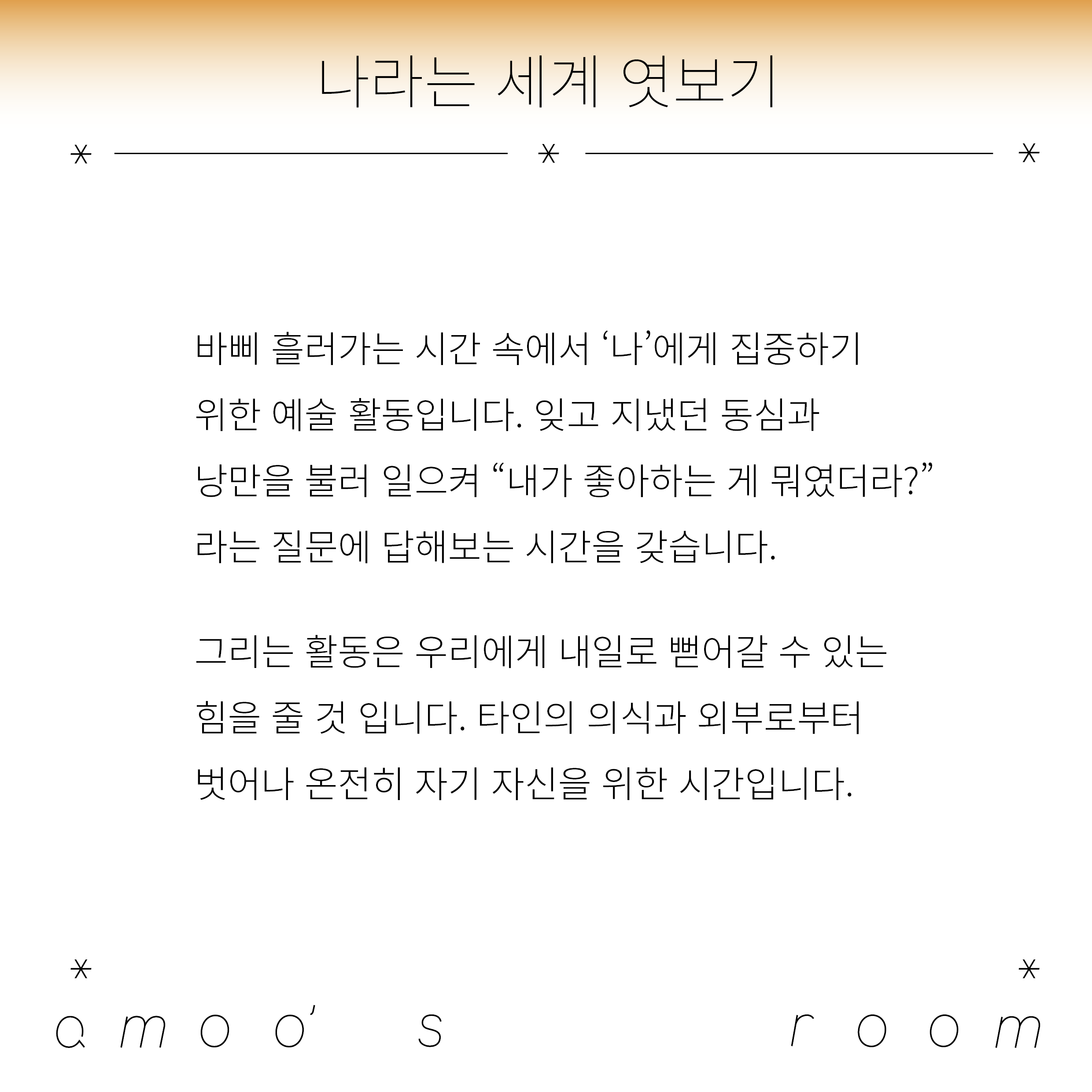 바삐 흘러가는 시간 속에서 ‘나’에게 집중하기 위한 예술 활동입니다. 잊고 지냈던 동심과 낭만을 불러 일으켜 “내가 좋아하는 게 뭐였더라?” 질문에 답해보는 시간을 갖습니다. 그리는 활동은 우리에게 내일로 뻗어갈 수 있는 힘을 줄 것 입니다. 타인의 의식과 외부로부터 벗어나 온전히 자기 자신을 위한 시간입니다.