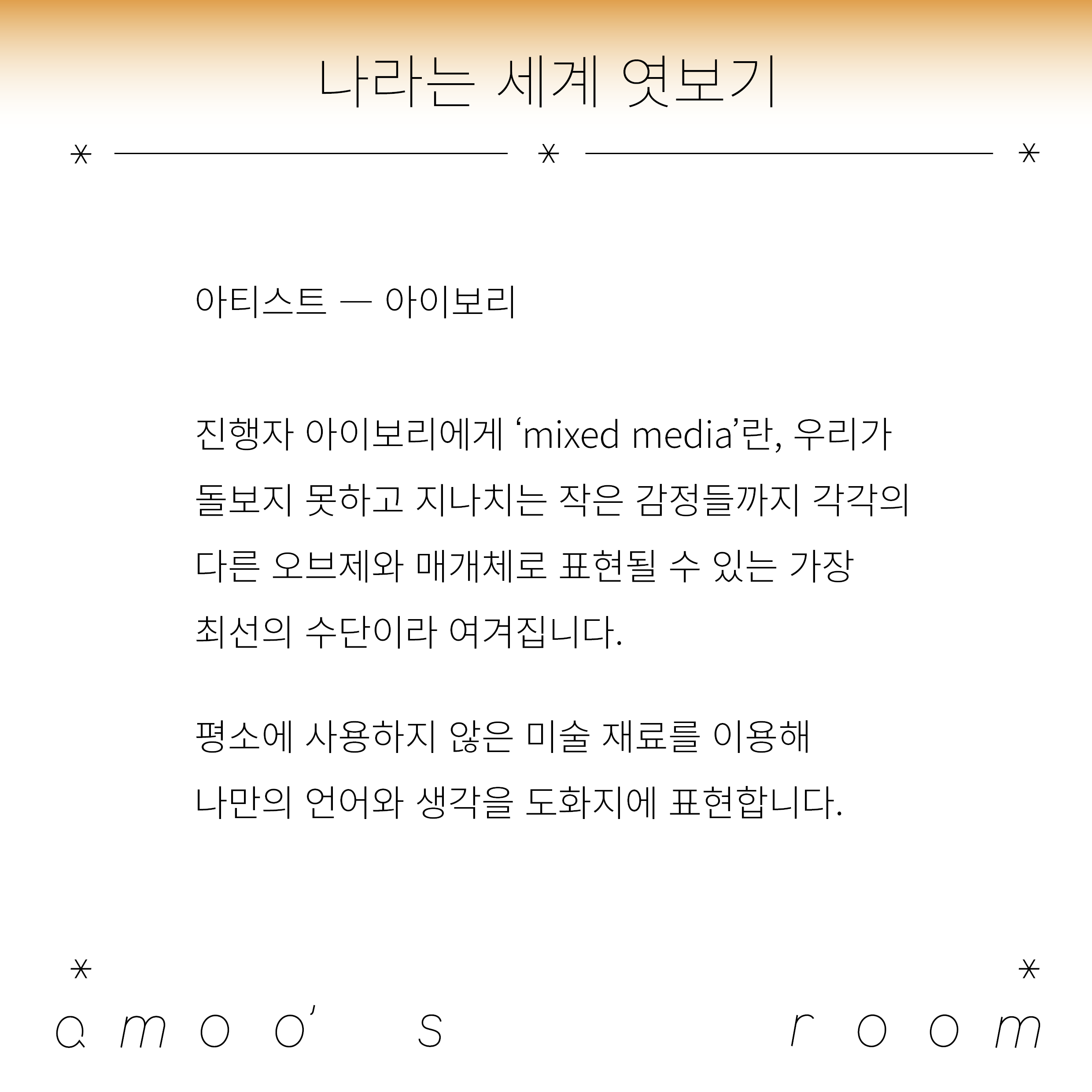 진행자 아이보리에게 mixed media란, 우리가 돌보지 못하고 지나치는 작은 감정들까지 각각의 다른 오브제와 매개체로 표현될 수 있는 가장 최선의 수단이라 여겨집니다.