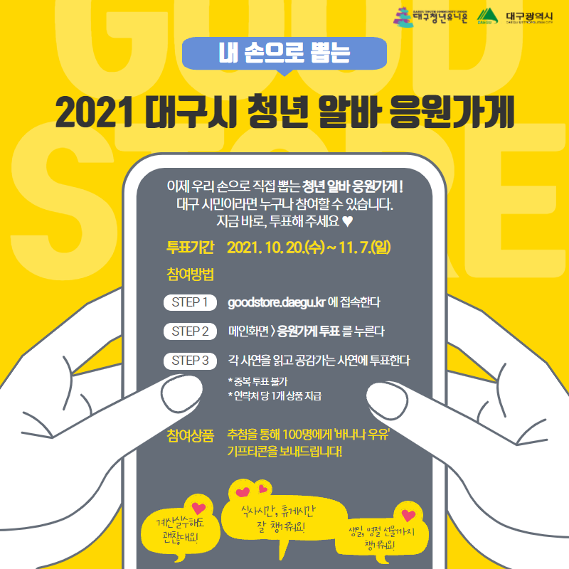 대구시 청년알바응원가게의 심사위원이 되어주세요! 올해부터는 시민투표심사가 추가되어, 심사위원단 심사(70%)+온라인 대구시민 투표(30%)로 2021 대구시 청년알바응원가게가 선정됩니다.