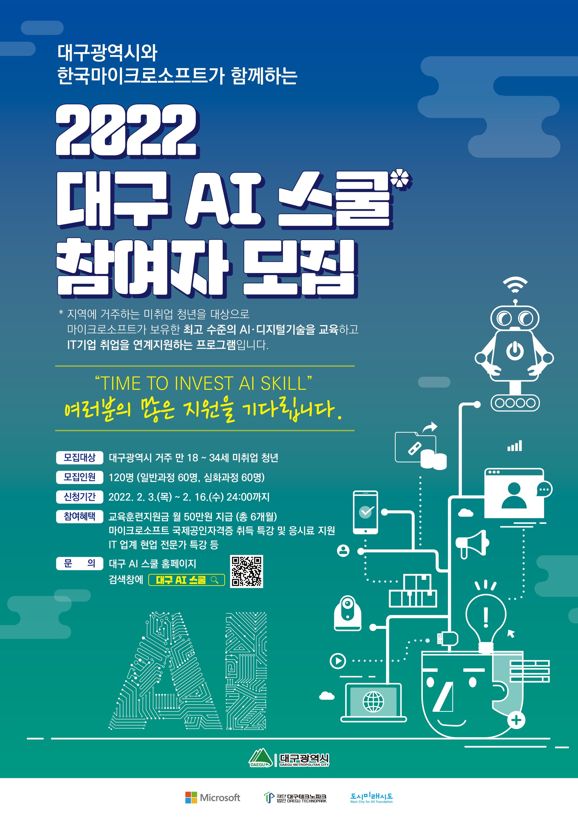 대구광역시-한국마이크로소프트 협력 프로젝트 「2022년 대구 AI 스쿨」 사업 참여자 모집작성자 : 배민아 작성일 : 22-02-03