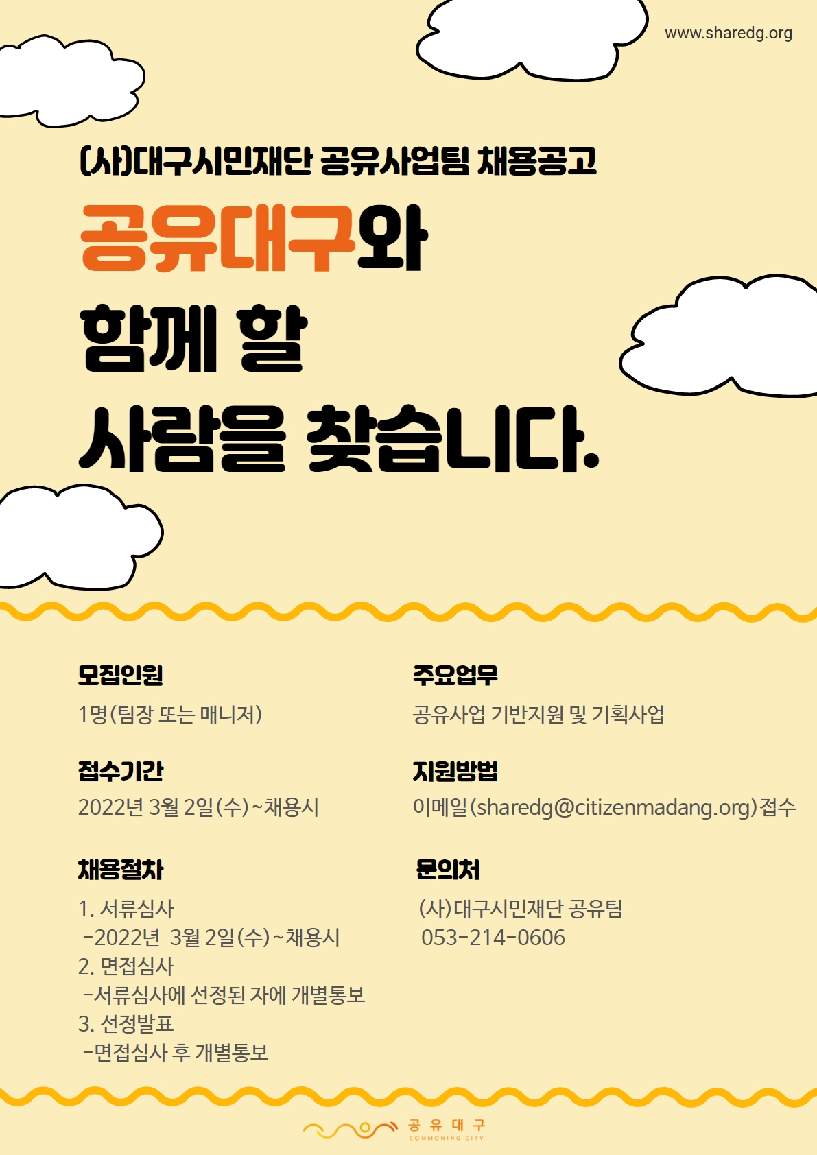 (사)대구시민재단 공유사업팀 직원 채용 공고작성자 : 정민경 작성일 : 22-03-14