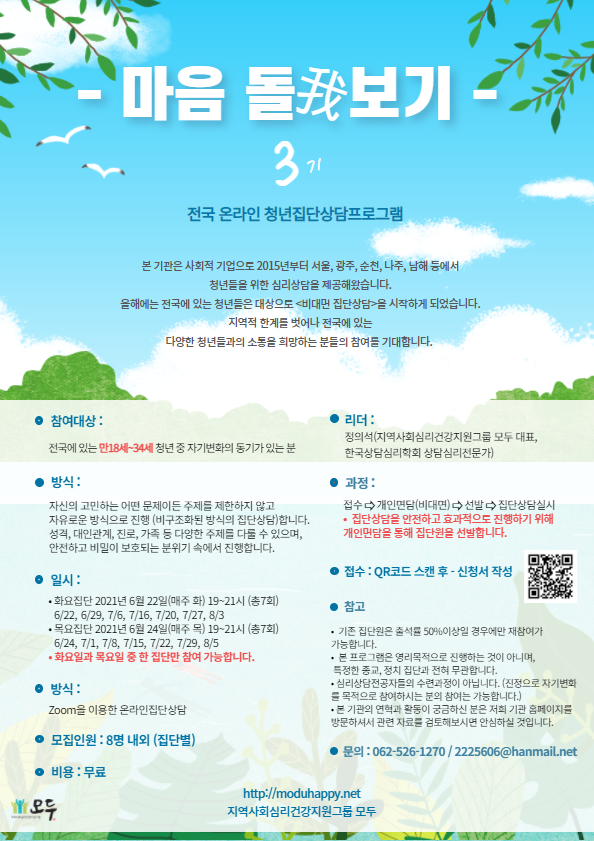 전국 청년대상 비대면 상담 <마음 돌아보기 3기> 참여자를 모집합니다.작성자 : 젊프 작성일 : 22-04-05