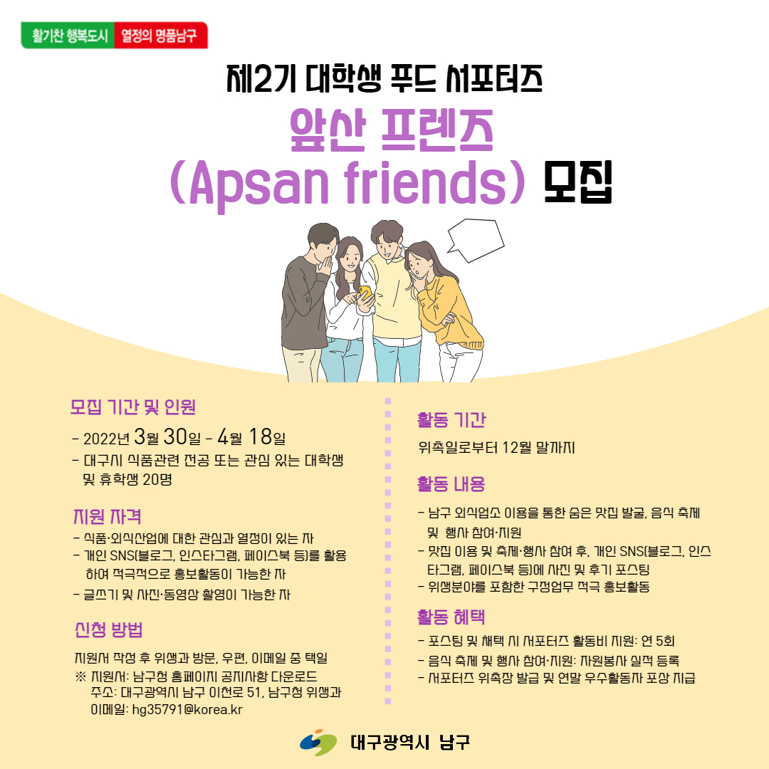남구의 숨은 맛집에 관한 다양한 소식을 SNS를 통해 적극적으로 홍보하여, 주민들의 남구 외식업소에 대한 관심과 참여를 제고하고 나아가 외식산업을 활성화 및 외식문화의 질적 향상을 도모하고자 아래와 같이 제2기 대학생 푸드 서포터즈 「앞산 프렌즈(Apsan friends)」모집하고자 합니다.