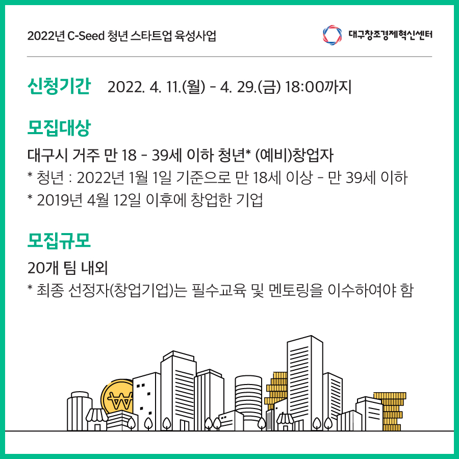 모집대상 대구시 거주 만 18-39세 이하 청년(예비)창업자
