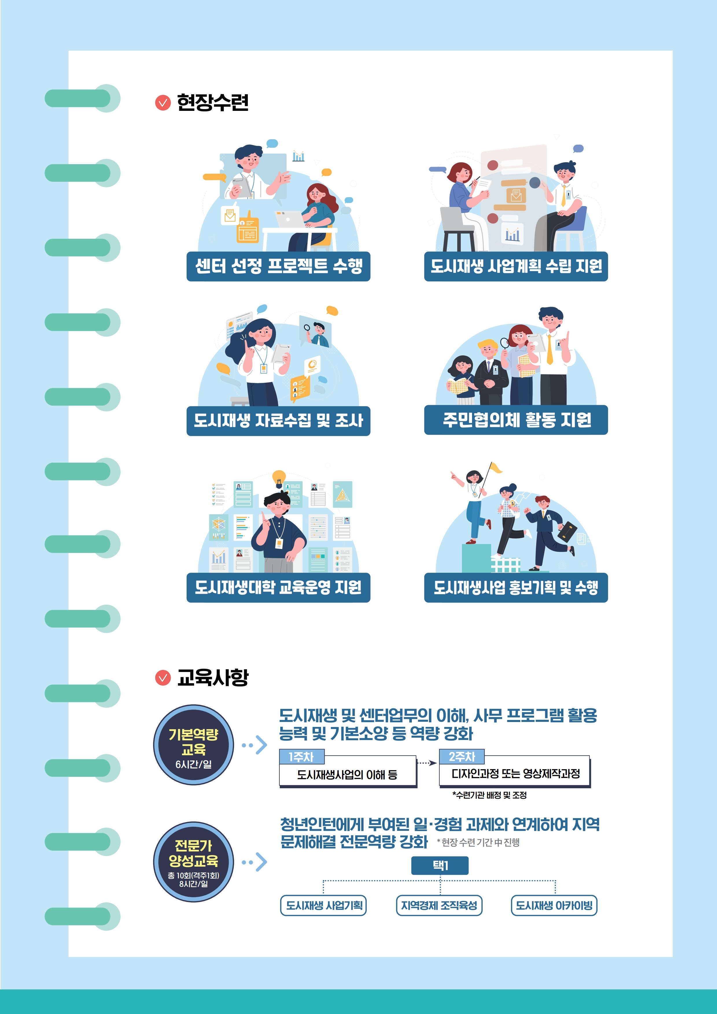 도시재생 관련 기본역량교육과 현장수련 및 전문가 양성교육 기회가 제공됩니다.