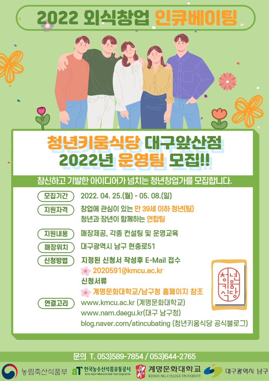 ● 사업개요 - 사업목적: 외식창업을 희망하는 청년을 대상으로 일정기간 동안 청년키움식당 운영기회를 제공함으로써 실제 외식업소 창업 시 시행착오를 최소화하고 역량있는 외식 경영가로 육성시키고자 함 - 사업기관: 계명문화대학교(사업수행기관), 대구 남구청(컨소시엄) - 매장위치: 대구광역시 남구 현충로 51 ● 참가 자격 및 응모 대상 - 신청 당시 만 19세~39세 이하 청년(청년 대표+장년 팀원 가능) <우대사항> ⦁ 외식 창업 의지가 강한 팀 ⦁ 대구광역시 남구에 거주하는 청년을 다수 보유한 팀 ⦁ 사업 종료 후 대구광역시 남구에 창업 예정인 팀 ⦁ 젊은 감성이 묻어나는 이색적인 외식 아이템을 가진 팀 ● 모집 분야 - 참신한 아이디어가 돋보이는 식사 메뉴 레시피를 보유한 팀 - 포장, 배달 등 테이크아웃류 메뉴 레시피를 보유한 팀 - 기타 상기사항 이외 개성있는 외식 아이템을 보유한 팀 ● 활동 내용 - 청년 키움식당 대구 앞산점 운영기회 제공 - 외식업소 운영에 대한 회계·노무·메뉴개선 컨설팅·서비스 교육 실시 - 효율적인 외식업소 홍보를 위한 마케팅 교육 실시 ● 모집 일정 - 모집기간: ~’22. 5. 8.(일) 까지 - 운영기간: 5월 ~6월 ※ 자세한 추진 일정은 모집공고(붙임파일) 참조 ● 모집 방법 - 신청서 등 첨부서류 작성 후 이메일 제출(2020591@kmcu.ac.kr) ● 유의 사항(신청제한) - 신청서, 사업계획서 등 본 사업 관련 서류를 허위로 기재한 경우 - 타 중앙정부, 자치단체, 공공기관 등에서 창업팀 선정자로 기 지원을 받았거나, 타 사업과 지원기간(협약기간)이 중복되는 경우 ● 문의 사항 - 계명문화대학교 산학협력단 (☏053-589-7854) - 대구광역시 남구청 위생과 (☏053-664-2765)