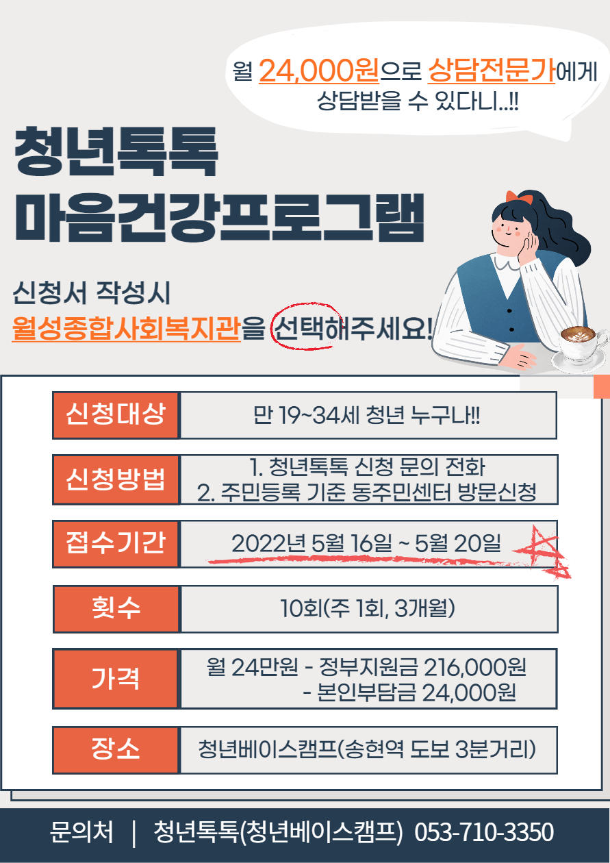 보건복지부 지원 대구청년사회서비스사업단에서 만19세-34세 대구청년을 위한 신체건강& 마음건강 청년톡톡 대구청년사회서비스 참여자를 모집합니다~~