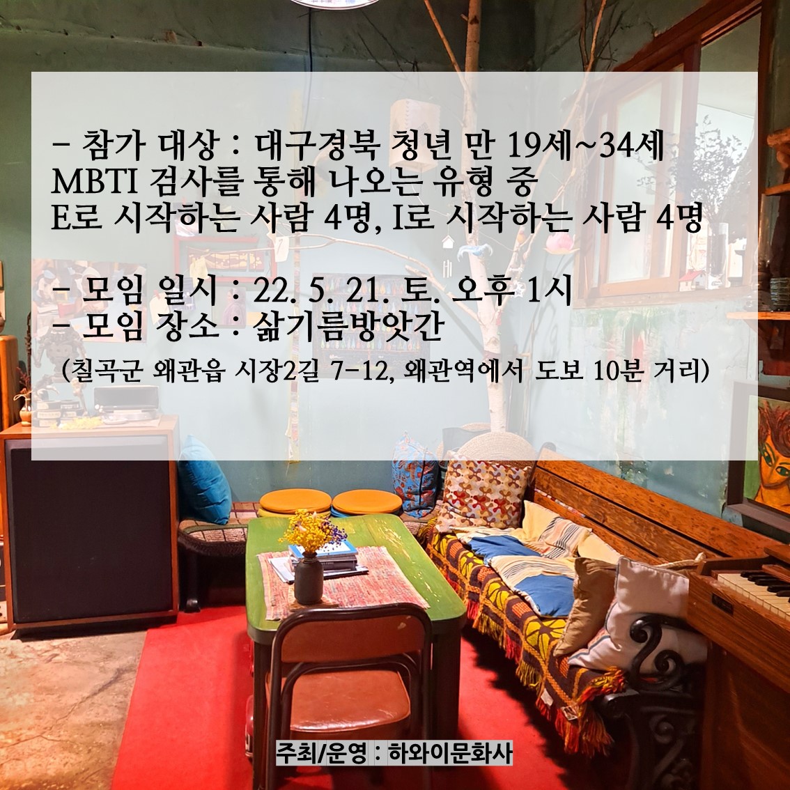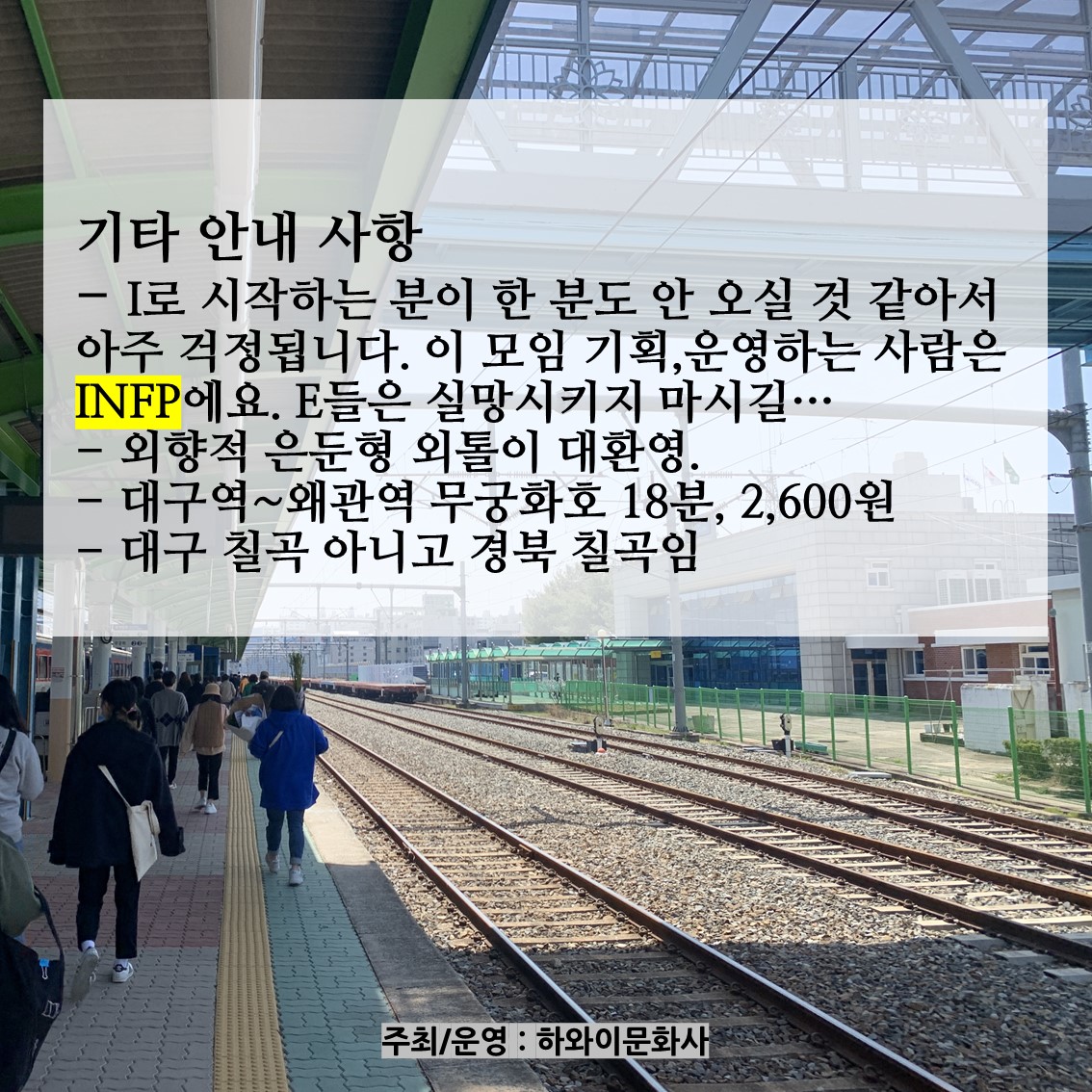- 모임 장소 : 삶기름방앗간 (칠곡군 왜관읍 시장2길 7-12, 왜관역에서 도보 10분 거리)