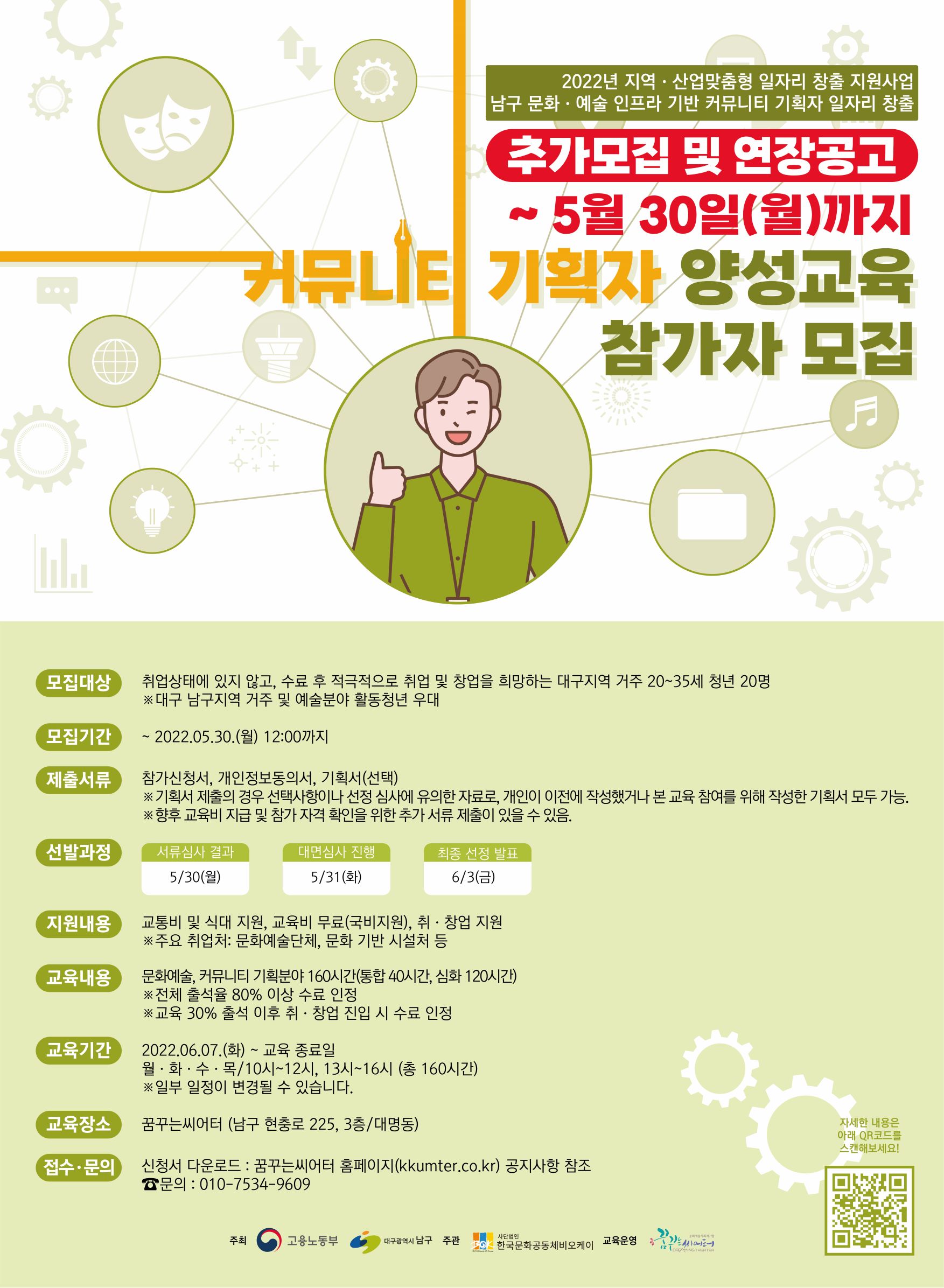 [취업연계 프로그램] 문화·예술 인프라 기반 <커뮤니티 기획자 양성교육> 참여자 추가 모집작성자 : 최유미 작성일 : 22-05-20
