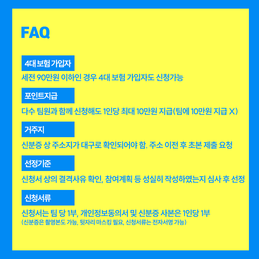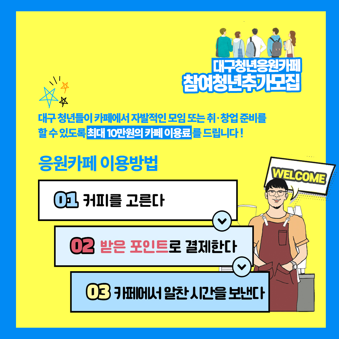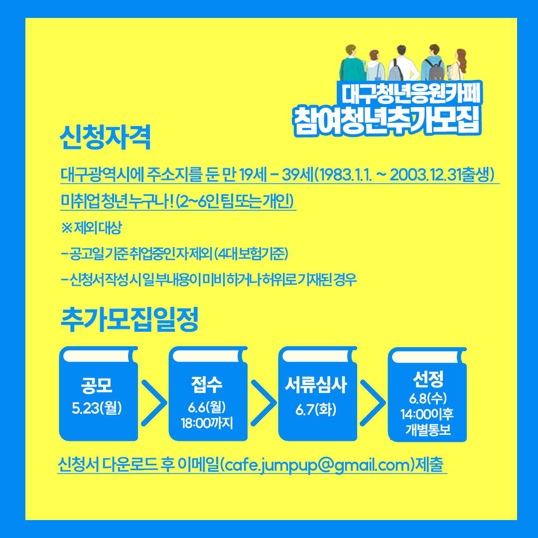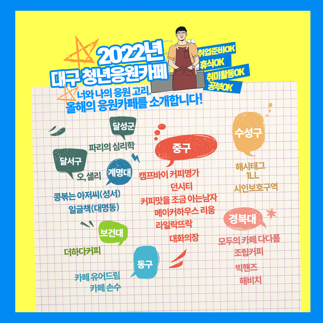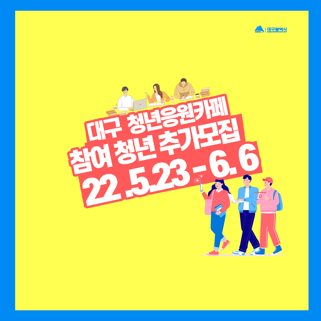 2022 대구청년응원카페 참여청년 추가모집 (-6/6)작성자 : 박효신 작성일 : 22-05-25