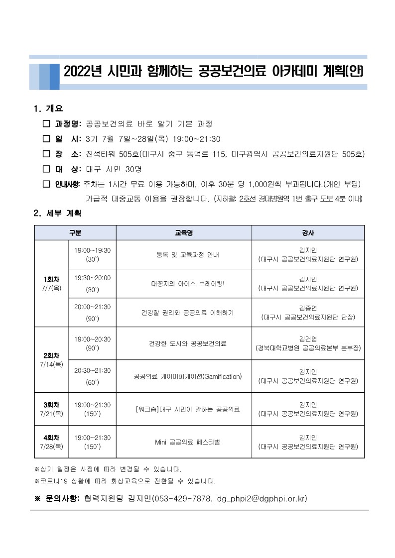 [선착순 모집완료] 제3기 시민과 함께하는 공공보건의료 아카데미 신입생 모집작성자 : 김지민 작성일 : 22-05-26