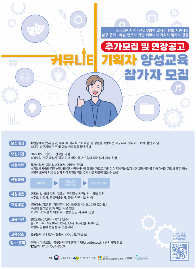 #대구_남구청과 #사단법인_비오케이 가 주관하고, #꿈꾸는씨어터 가 교육운영하는 2022년 지역산업맞춤형 일자리지원사업 '커뮤니티기획자 양성과정'이 참가자 모집을 시작했습니다!