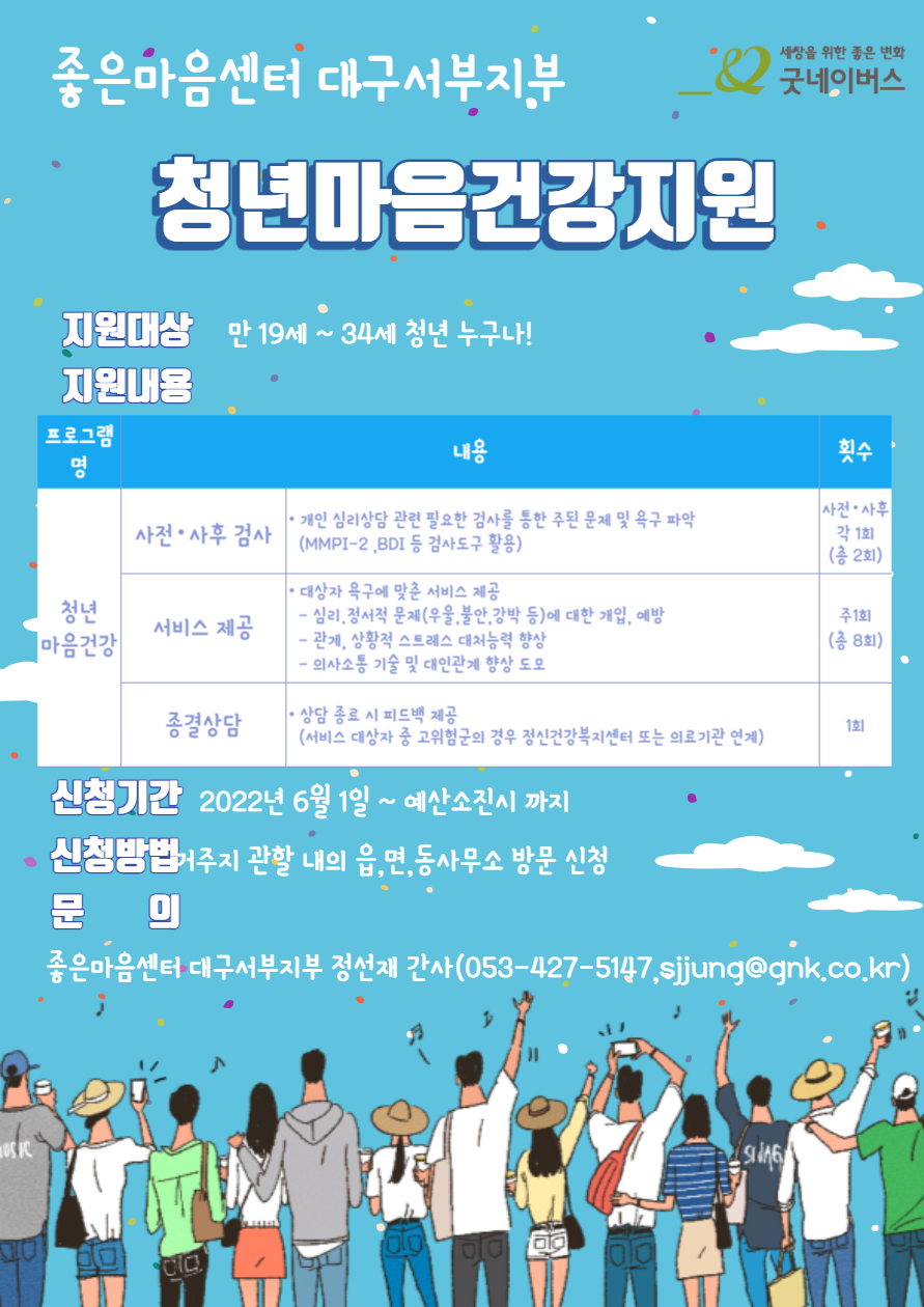 문 의 : 좋은마음센터 대구서부지부 정선재 간사 (053-427-5147)
