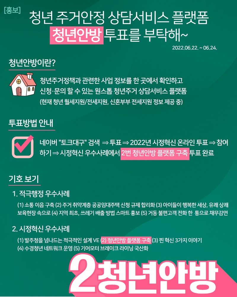 청년 주거안정 상담서비스 플랫폼 "청년안방" 투표를 부탁해작성자 : 젊프 작성일 : 22-06-22