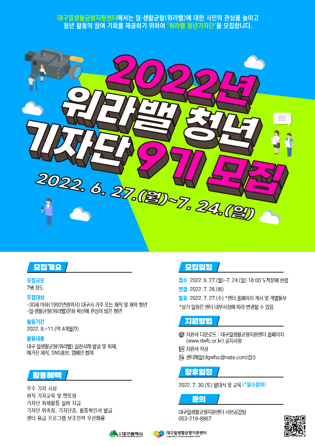 2022 워라밸 청년기자단 9기 모집작성자 : 김유정 작성일 : 22-06-27