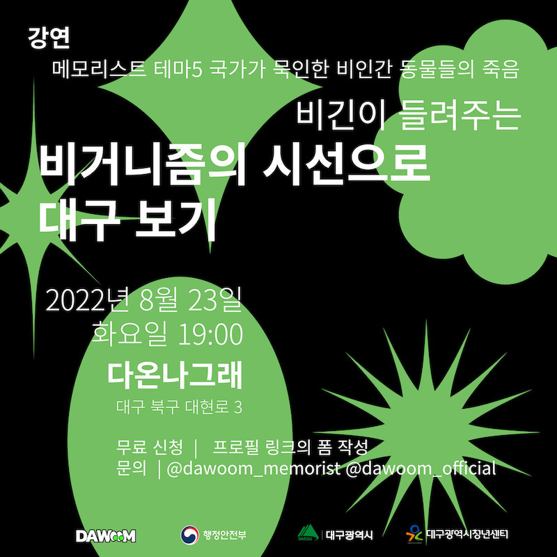 💚 메모리스트에는 총 5가지 테마가 있고, 그 중 다섯번째 테마인 국가가 묵인한 비인간 동물들의 죽음에 대한 강연을 열고자합니다.