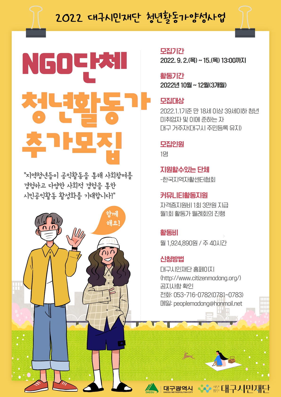2022년 청년사회활동가양성사업(청년NGO) 7차 추가청년(인턴) 모집작성자 : 대구시민센터 작성일 : 22-09-02