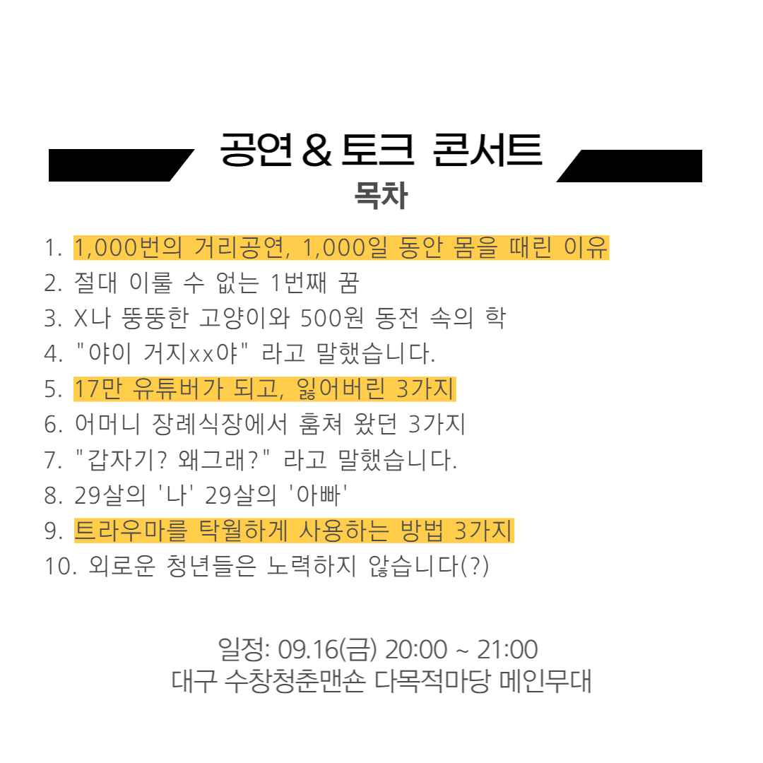 대구청년주간 Happy Youth Day 정박수의 토크콘서트작성자 : 젊프 작성일 : 22-09-08 대구광역시청년센터