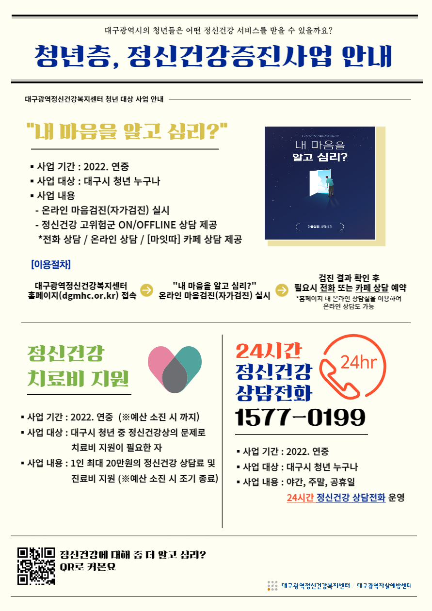 청년층, 정신건강증진사업 안내작성자 : 대구광역정신건강복지센터/대구광역자살예방센터 작성일 : 22-09-14