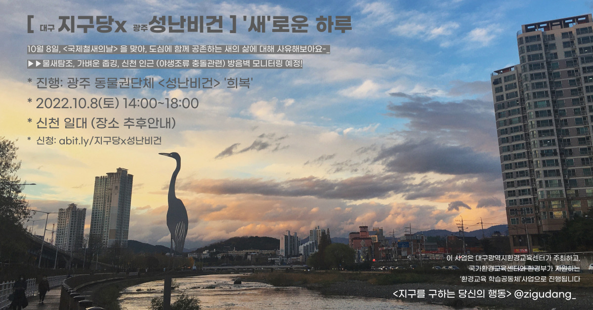 🕊10월 8일 #세계철새의날 을 맞이하여 <지구당>은 <성난비건>과 함께 도심에서 위기에 처한 야생조류의 삶을 함께 만나고, 다양한 실천방안을 모색할 수 있는 시간을 마련했습니다! 함께 머리 맞대어보아요!!