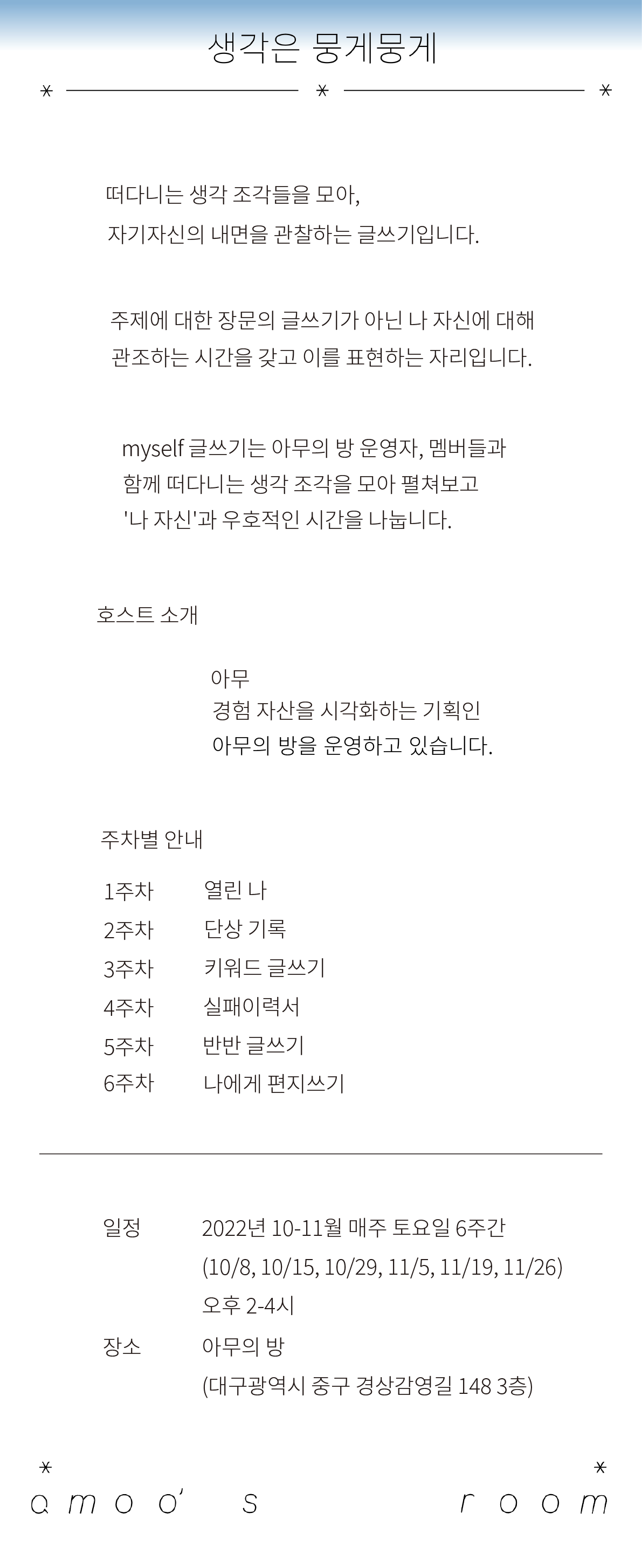 자아성장 글쓰기 /생각은 뭉게뭉게/ 멤버 모집작성자 : 송하영 작성일 : 22-09-29