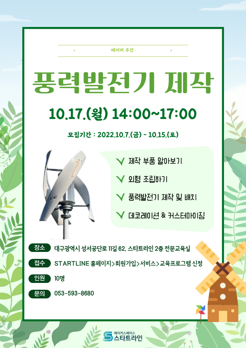 👉풍력발전기 제작 교육 신청 링크 : http://startline.kr/contents/03_service/board.html?board_id=board_education&mode=view&no=65&cate=
