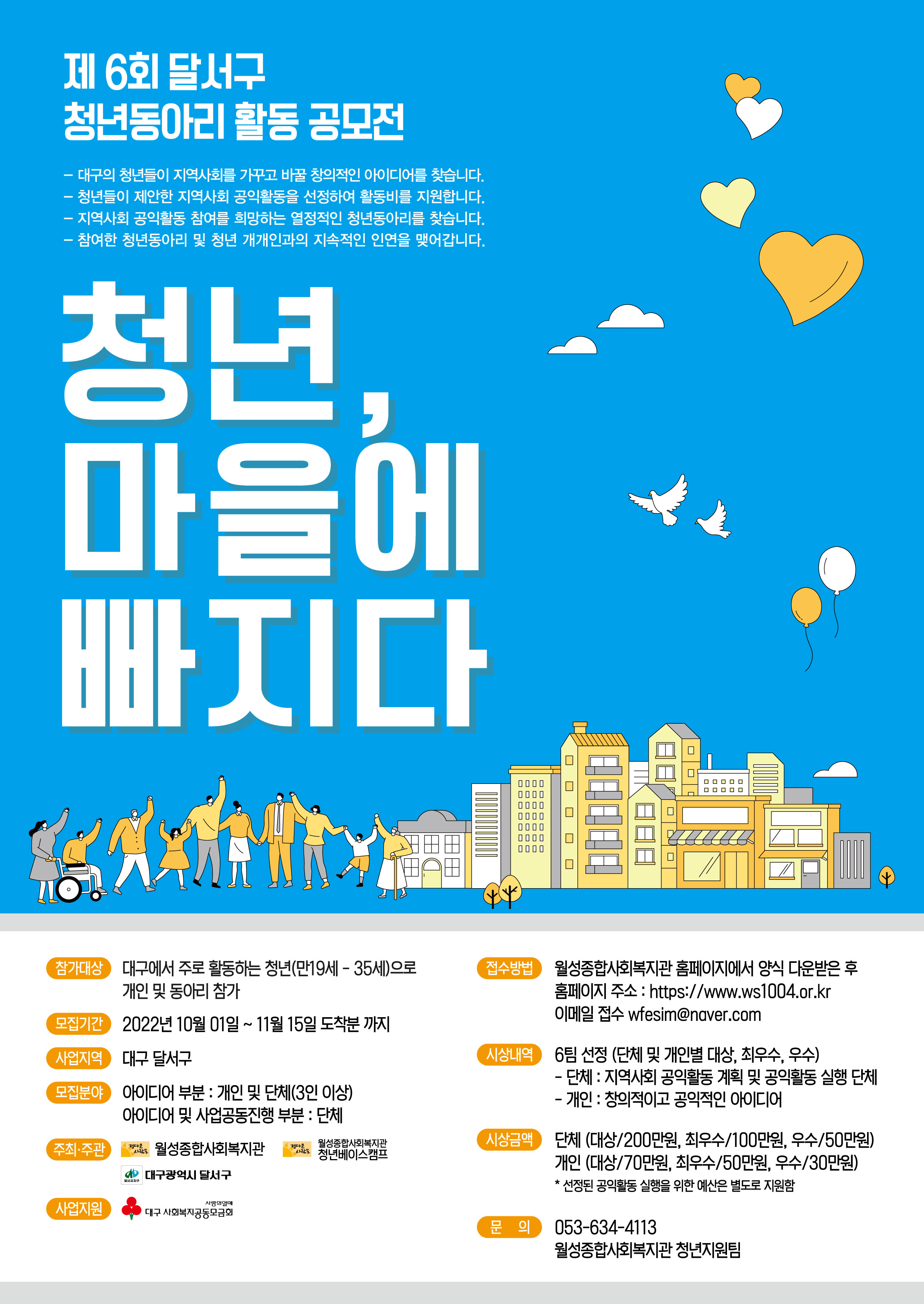 월성종합사회복지관에서는 청년들이 제안한 지역사회공익활동을 지원하고자 제 6회 달서구 청년동아리 지역활동 공모전을 진행합니다.