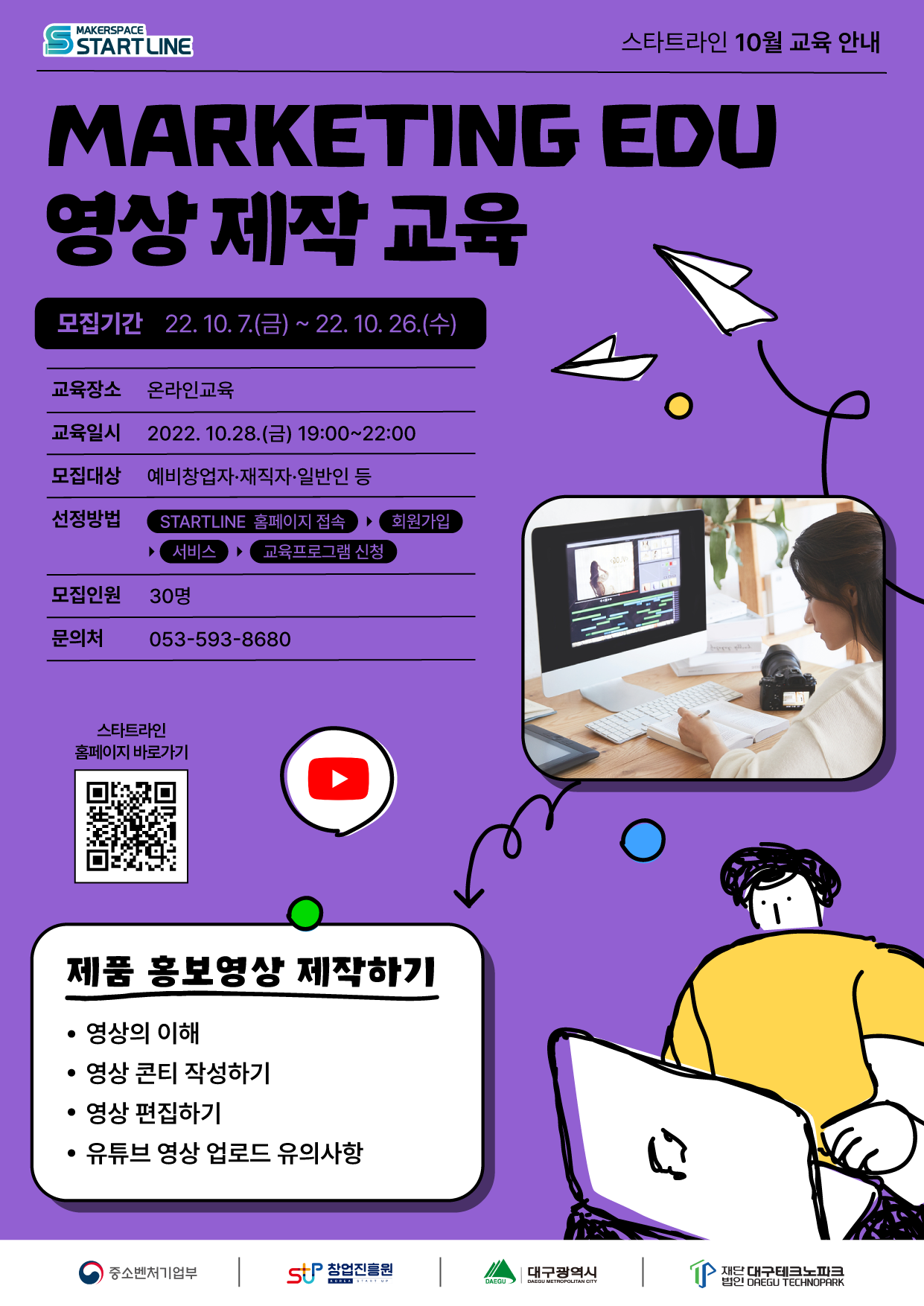 👉영상 제작 교육 신청 링크 : http://startline.kr/contents/03_service/board.html?board_id=board_education&mode=view&no=63&cate=