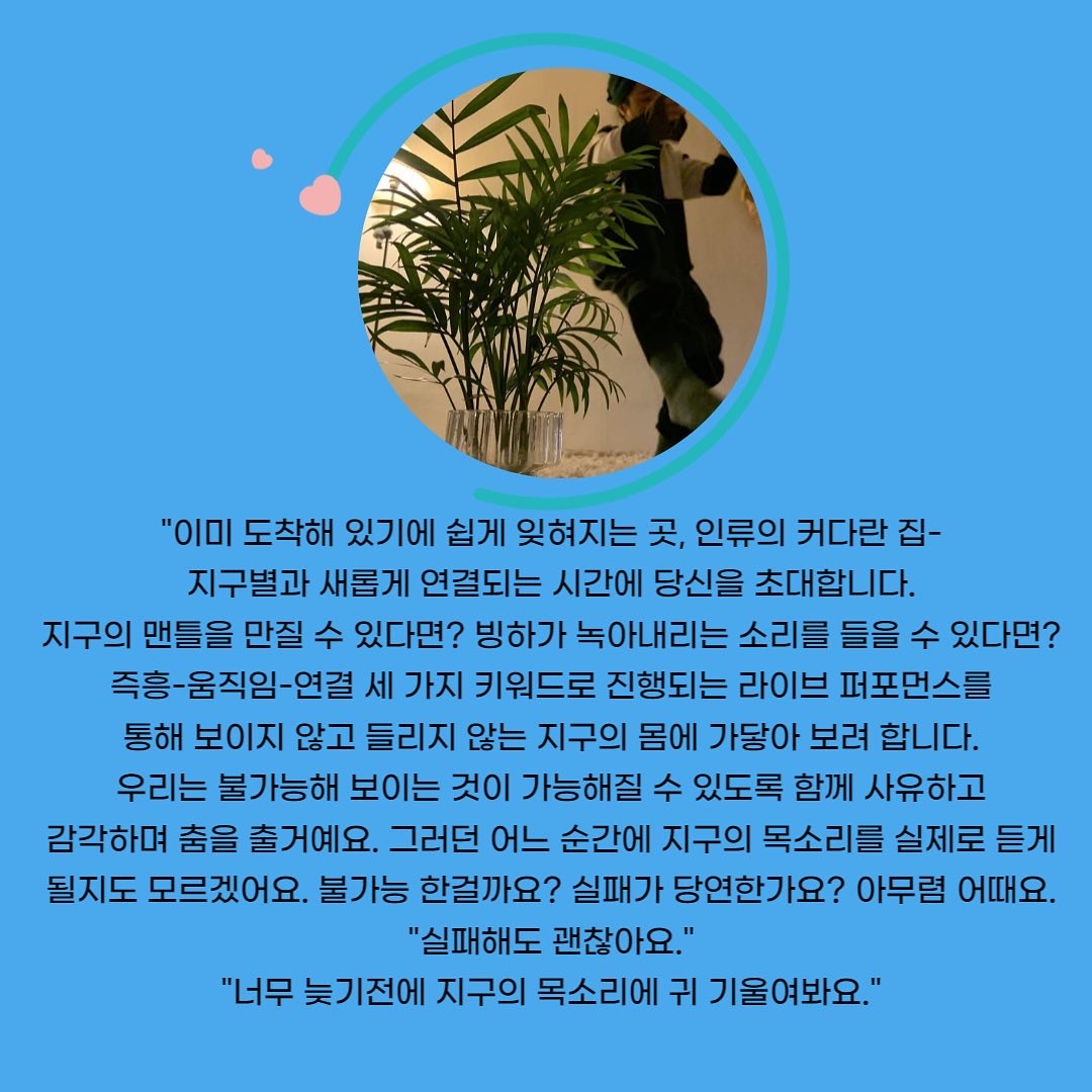 즉흥-움직임-연결 세 가지 키워드로 진행되는 라이브 퍼포먼스를 통해 보이지 않고 들리지 않는 지구의 몸에 가닿아 보려 합니다. 우리는 불가능해 보이는 것이 가능해질 수 있도록 함께 사유하고 감각하며 춤을 출거예요. 그러던 어느 순간에 지구의 목소리를 실제로 듣게 될지도 모르겠어요.