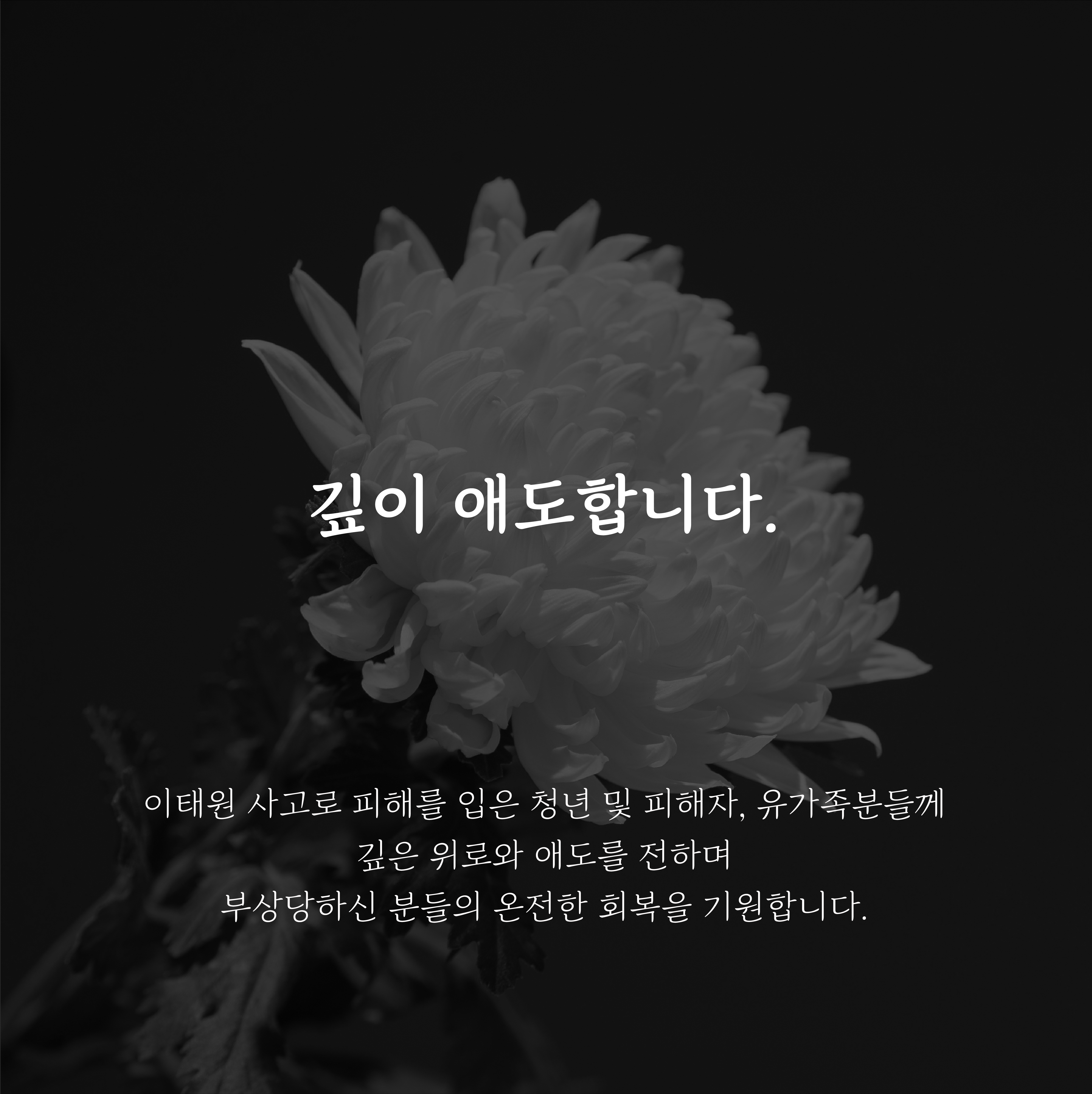 현재 모집 중 해당 페이지의 게시글은 지역의 다양한 기관에서 직접 작성하여 업로드 하는 방식으로 운영됩니다. 각 사업의 정보 및 신청 등 사업·프로그램 문의는 게시글 내 담당기관으로 문의 바랍니다. [ 기타] 이태원 사고에 대한 추모 작성자 : 젊프 작성일 : 22-10-31 대구광역시청년센터 기관명 대구광역시청년센터 모집일시 2022-10-29 ~ 2022-11-05 활동기간 2022-10-29 ~ 2022-11-05 신청링크 # #추모 전체 댓글수 (0) 목록 이전글 다음글