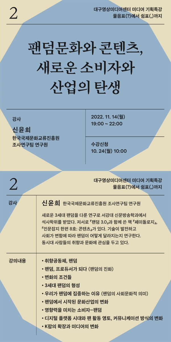 미디어기획특강 : 팬덤문화와 콘텐츠, 새로운 소비자와 산업의 탄생작성자 : 대구영상미디어센터 작성일 : 22-11-07