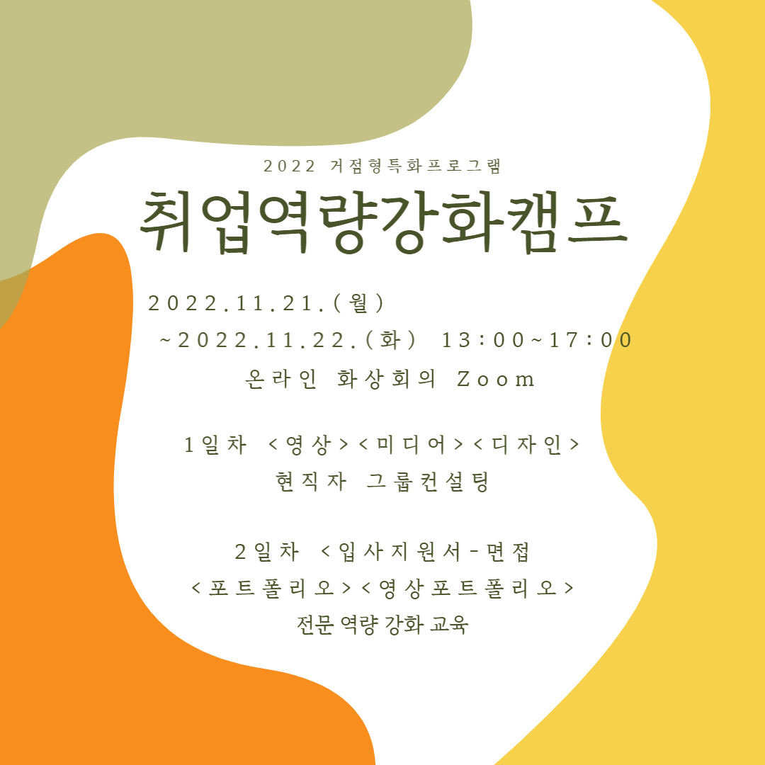 2022 거점형특화프로그램 <취업역량강화캠프 : 영상, 미디어, 디자인 편> 참가자 모집작성자 : 이재형 작성일 : 22-11-09