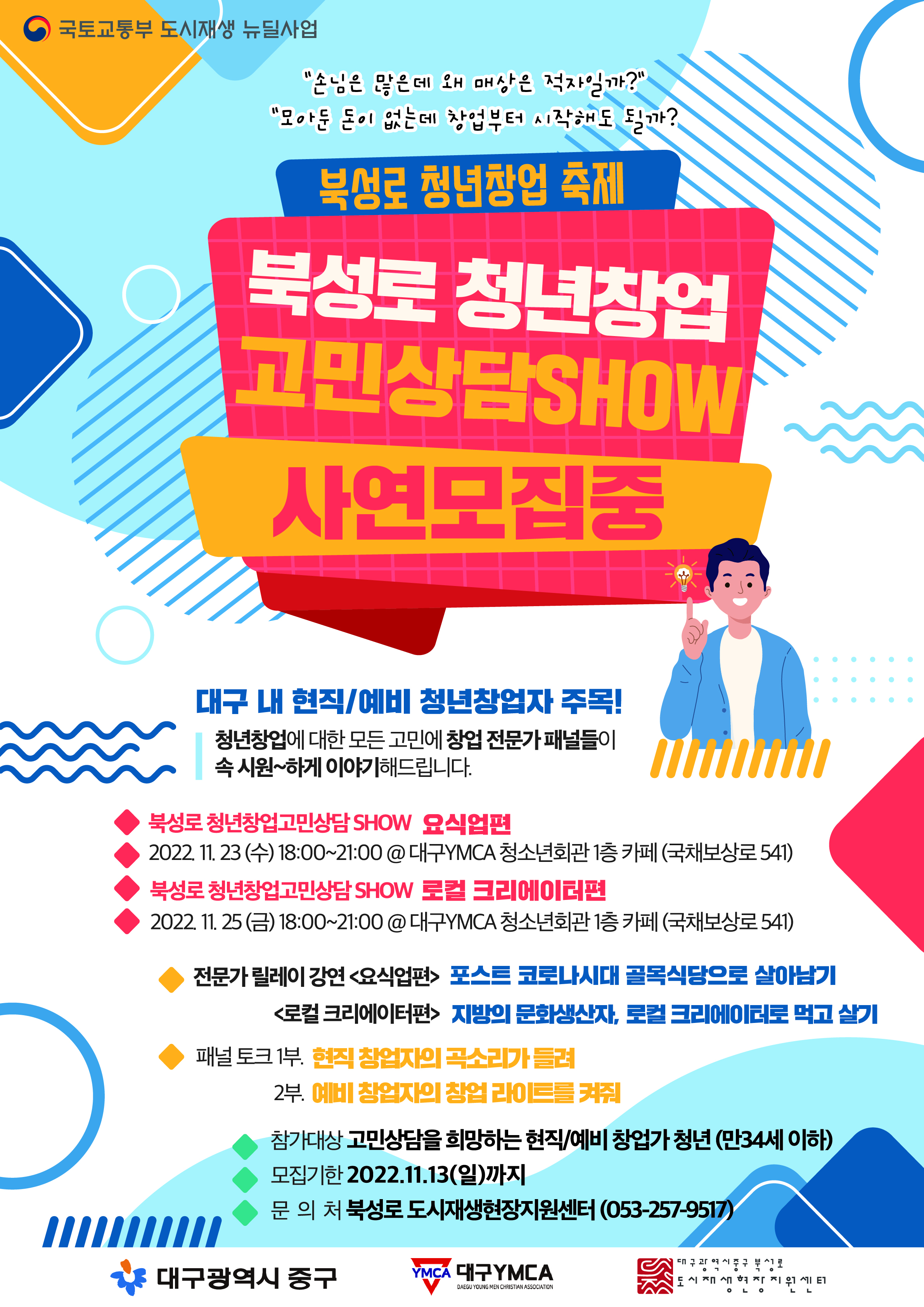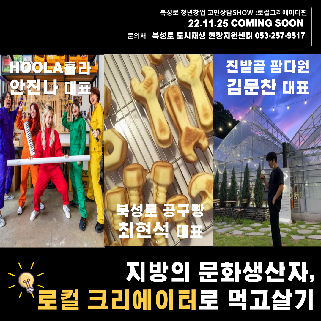 [토크콘서트] 북성로 청년창업 고민상담SHOW 사연 및 참가모집 *기간연장 (~11.20)작성자 : 이나영 작성일 : 22-11-15