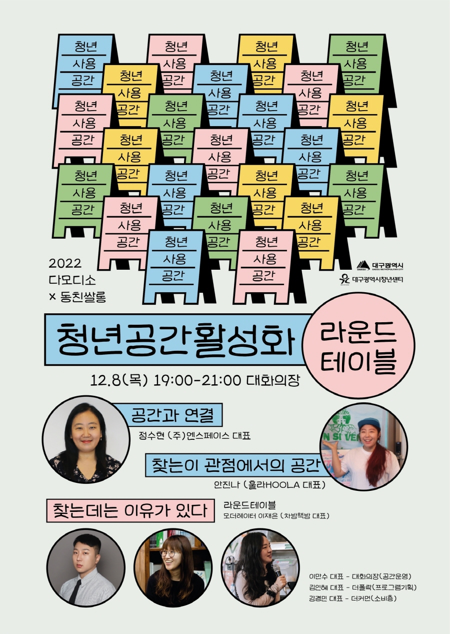 2022 동친쌀롱 '청년공간활성화라운드테이블' 참여자 모집작성자 : 이나리 작성일 : 22-11-28 대구광역시청년센터