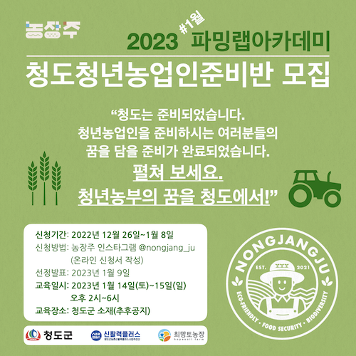청년농장주 2023년 1월 파밍랩아카데미 “청도청년농업인준비반 모집”작성자 : 서종효 작성일 : 22-12-28